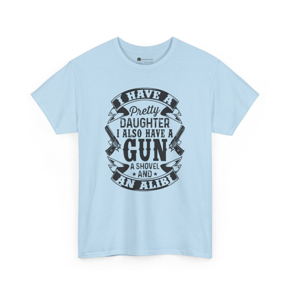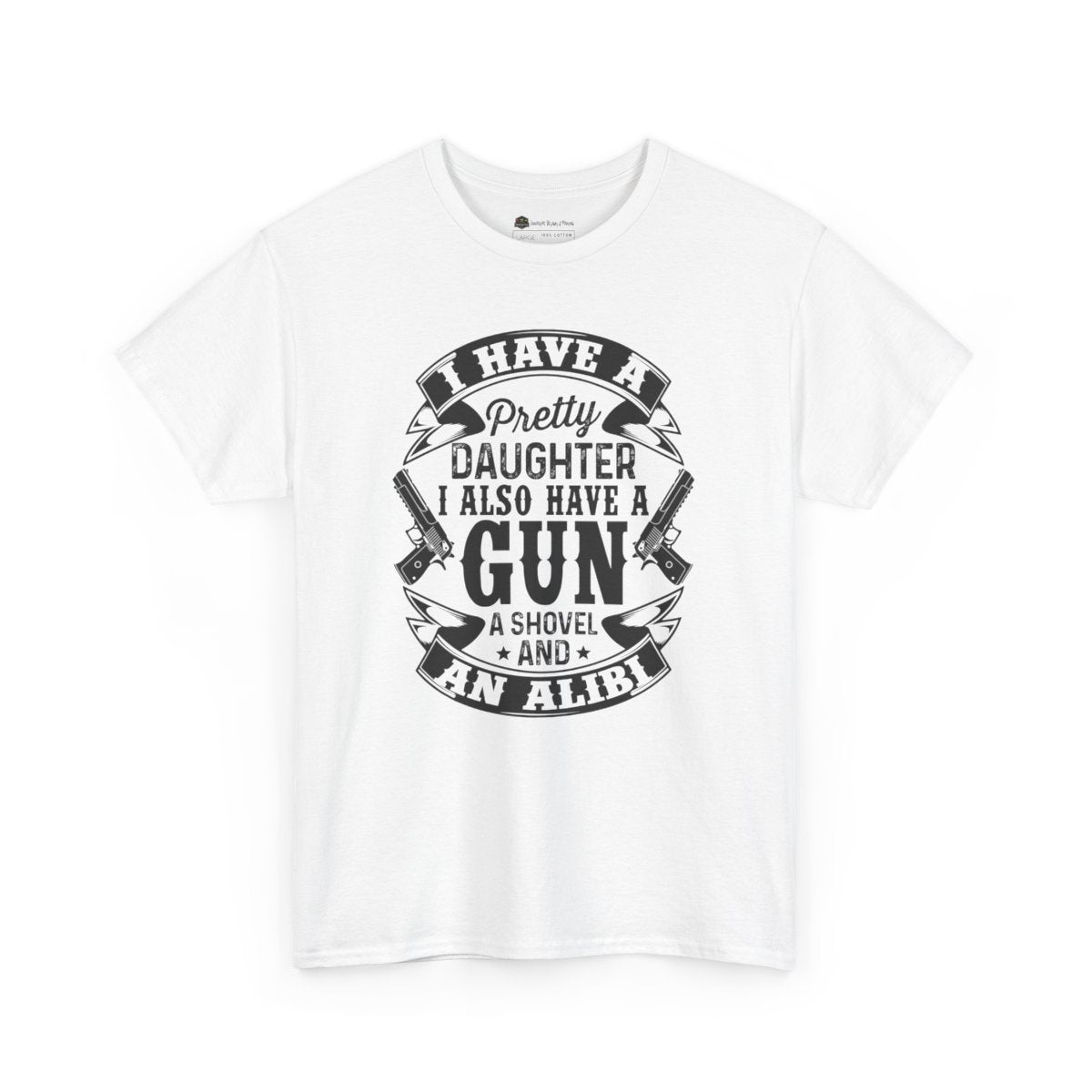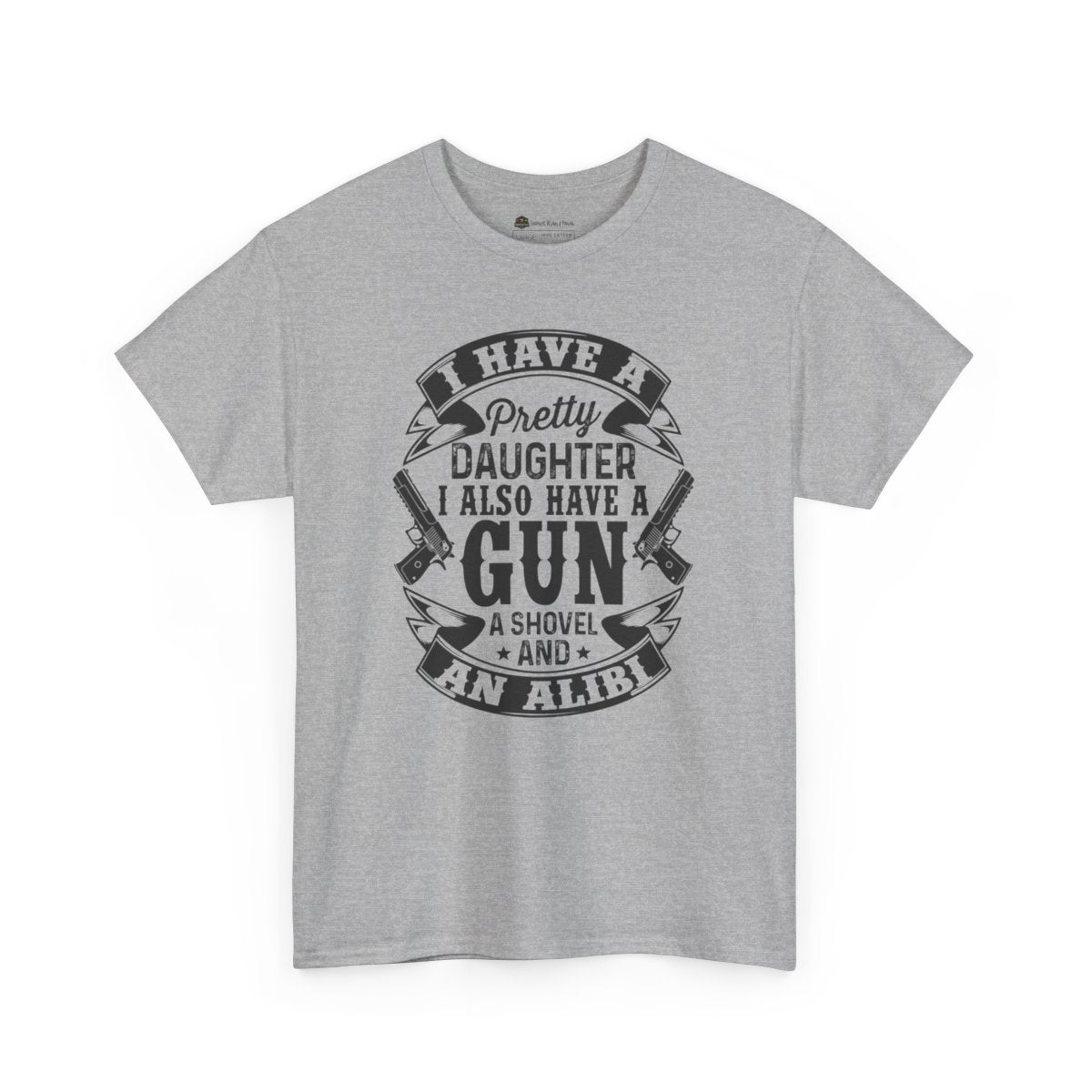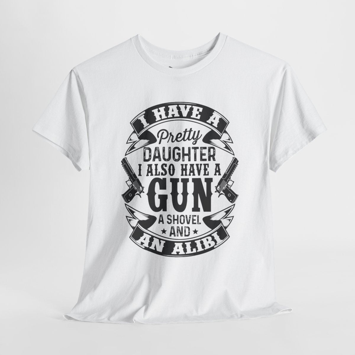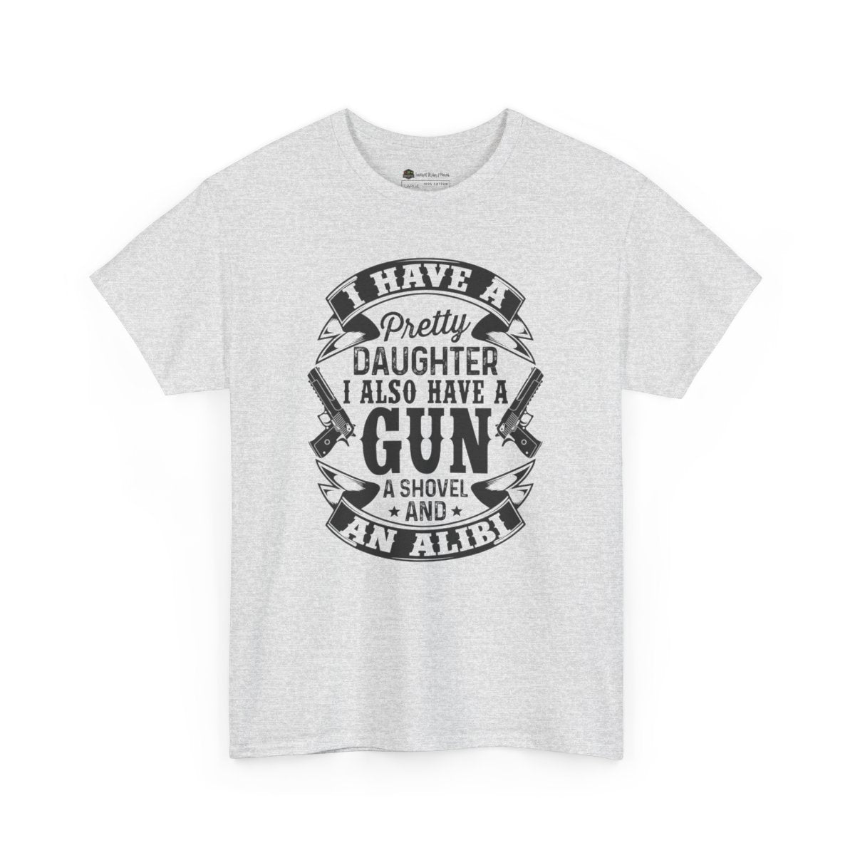 "I Have a Pretty Daughter... I Also Have a Gun, a Shovel, and an Alibi" - Adult Unisex Heavy Cotton T-Shirt
